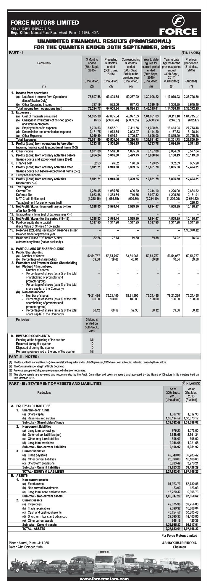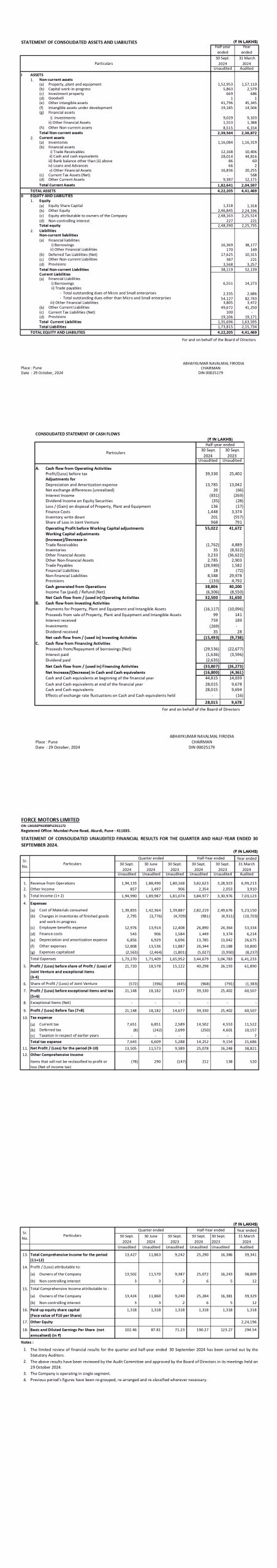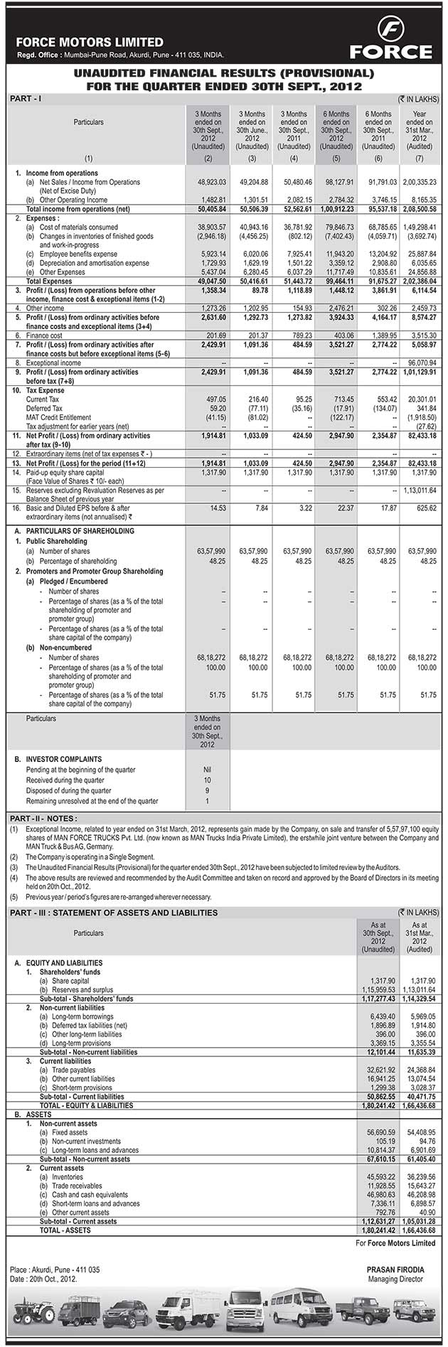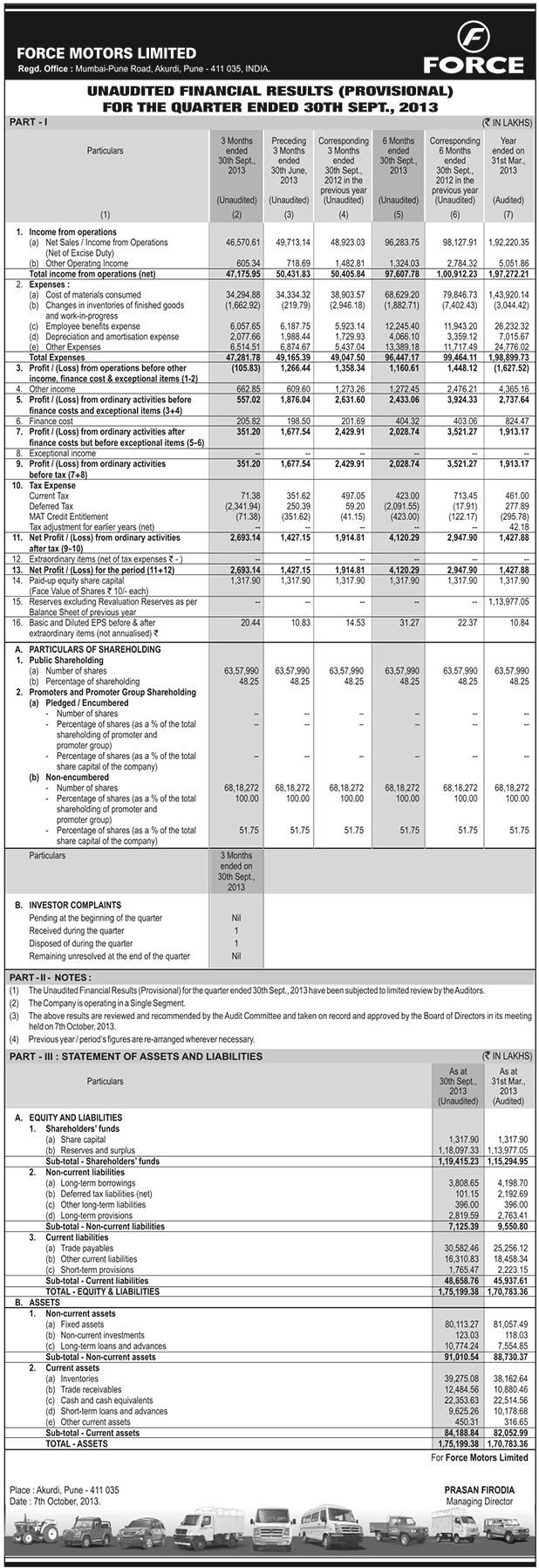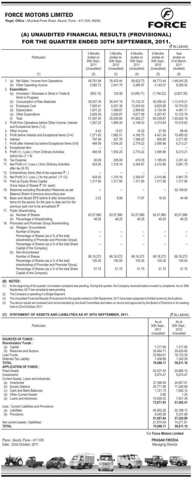 Unaudited Financial Results for the Quarter & half year Ended