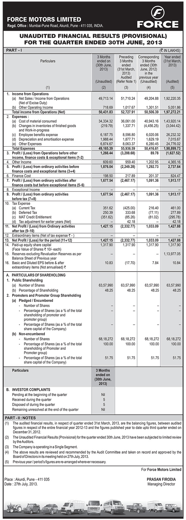 Unaudited Financial Results for the Quarter Ended