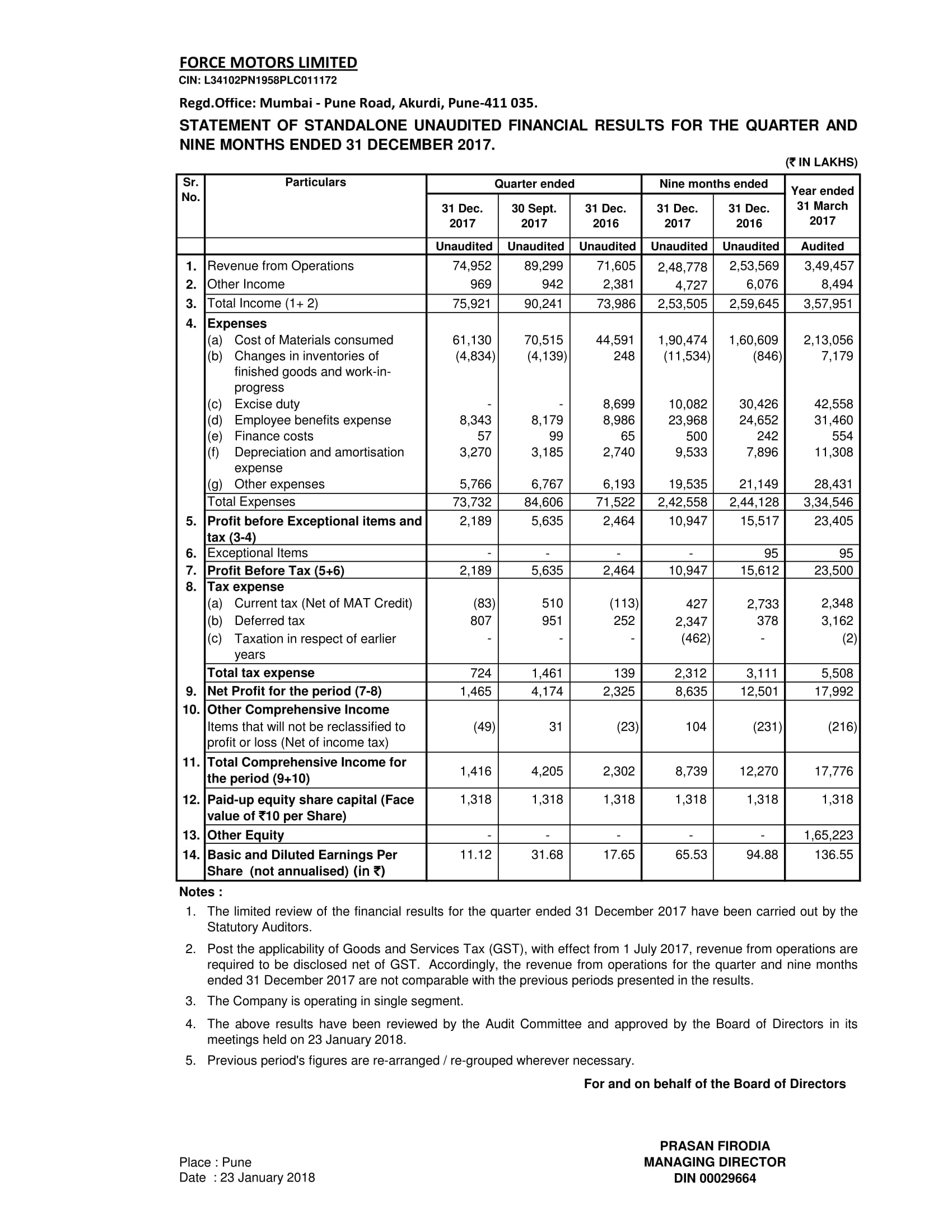 Outcome of the Board Meeting held on 23.01.2018
