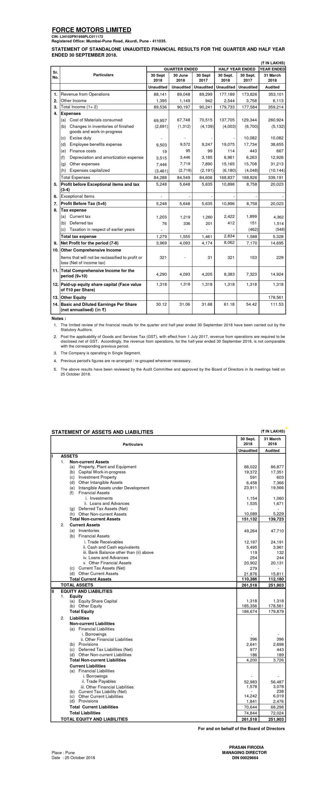 Unaudited Financial Results for the Quarter and Half Year ended 30 September 2018