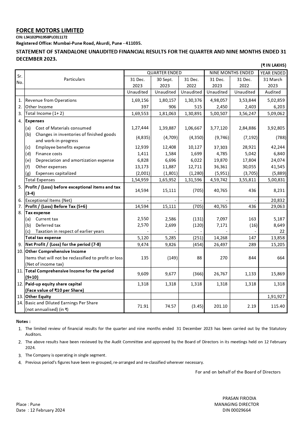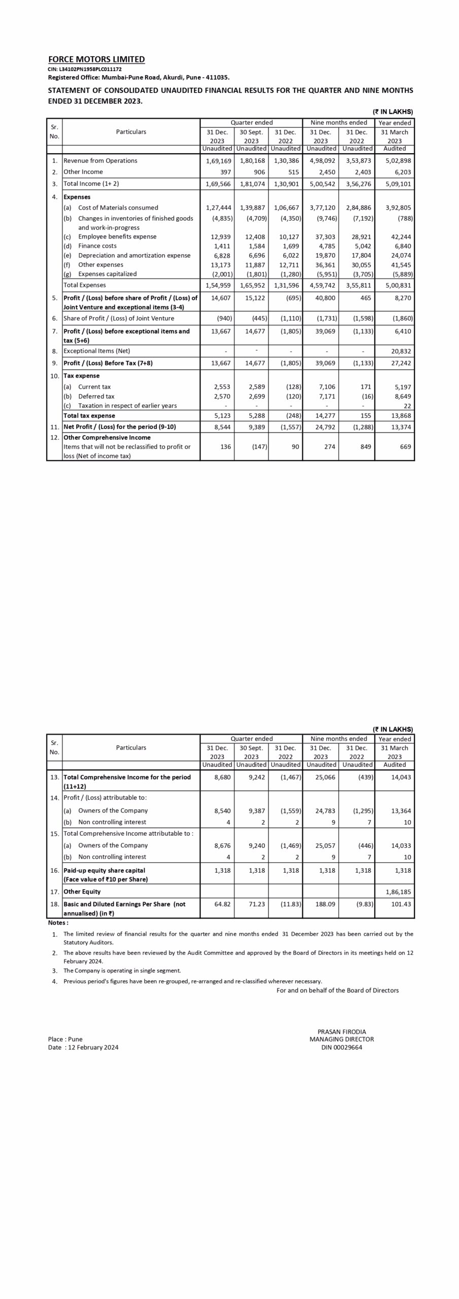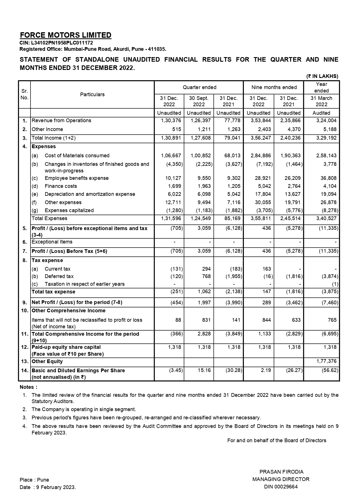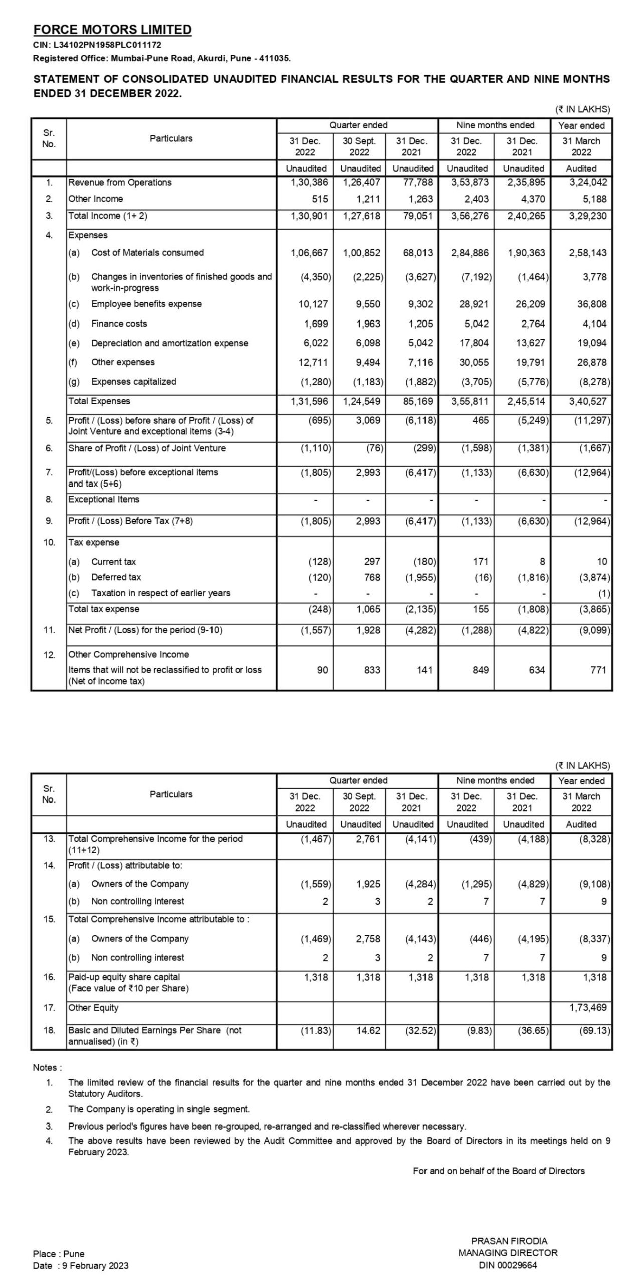 Statement of consolidated unaudited financial results for the quarter and nine months ended 31st December 2022.