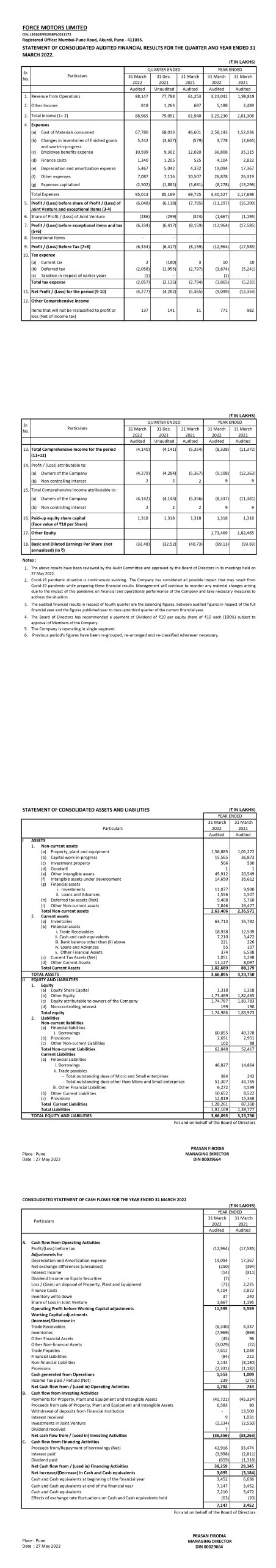 Statement of Consolidated Audited Financial Results for the Quarter and Year ended 31st March 2022.