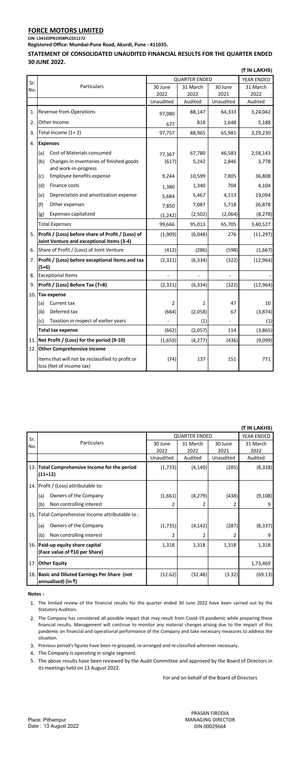 Statement of Consolidated Unaudited Financial Results For The Quarter Ended 30th June 2022.