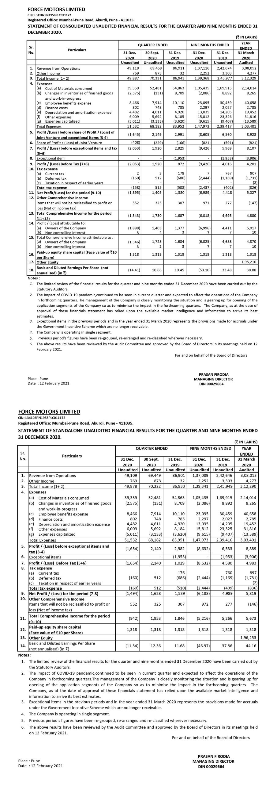 Financial Results for the Quarter and Nine months ended 31st December 2020.
