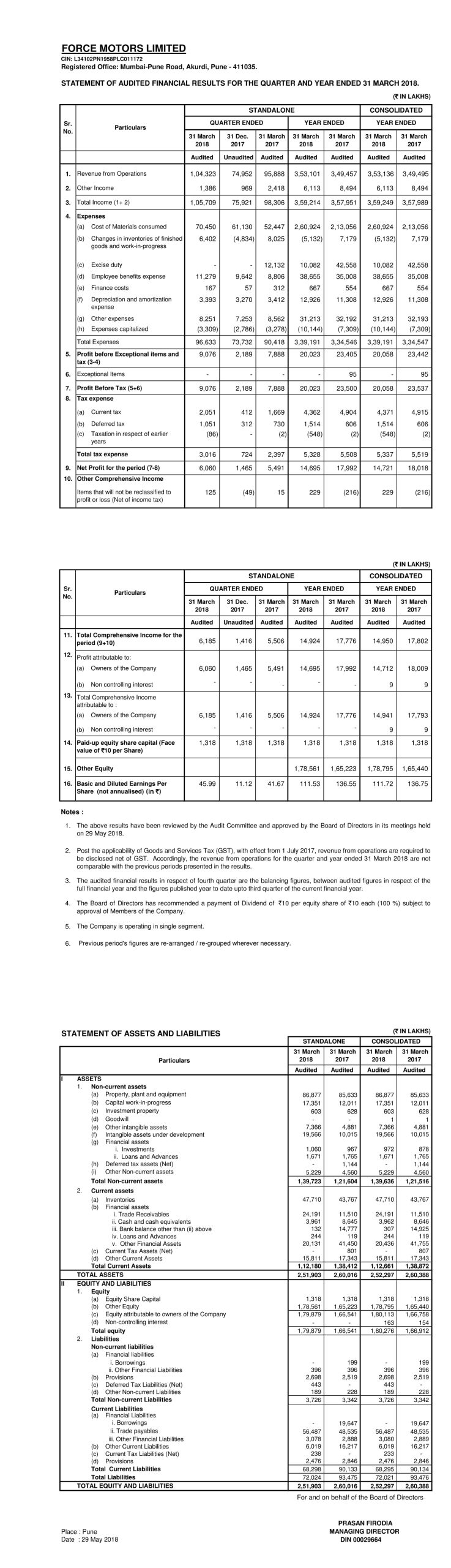 Outcome of the Board Meeting held on 29th May 2018