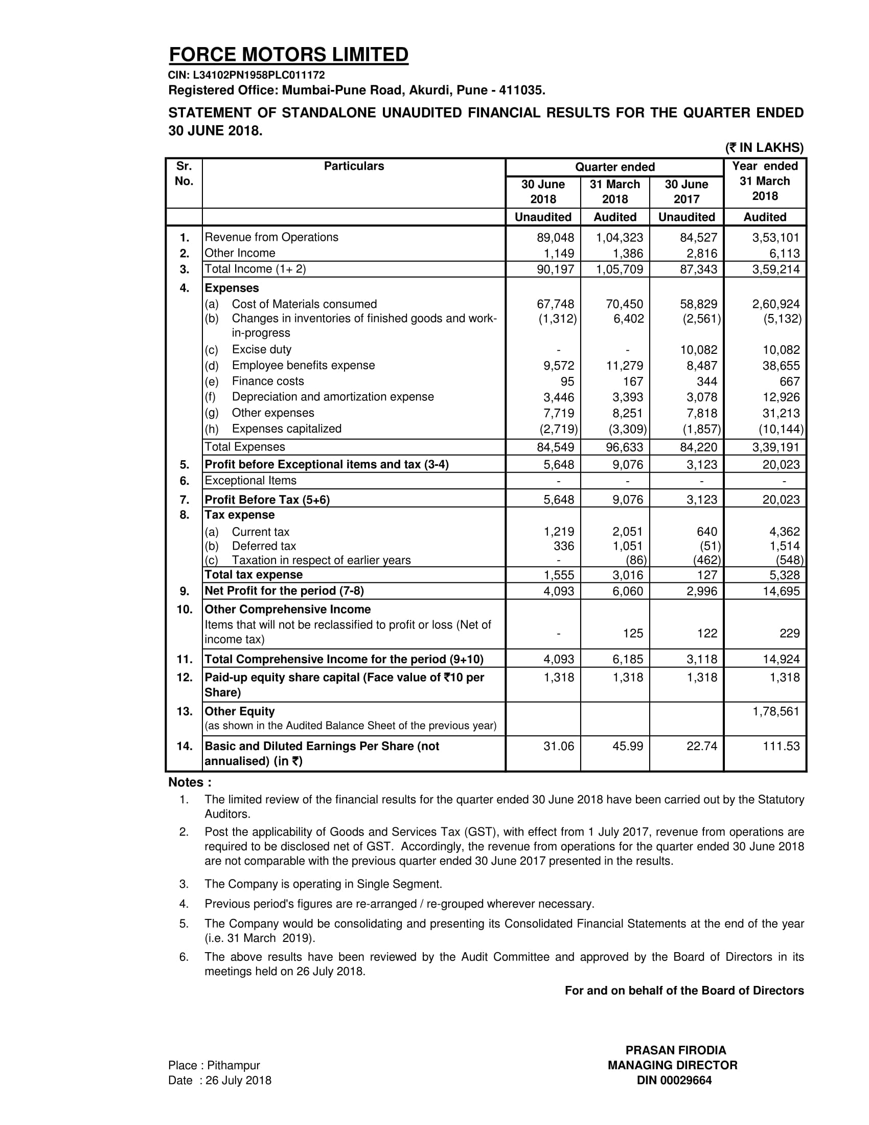 Unaudited Financial Results for the Quarter ended June 30, 2018