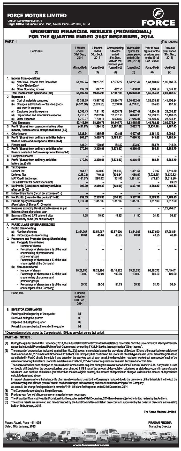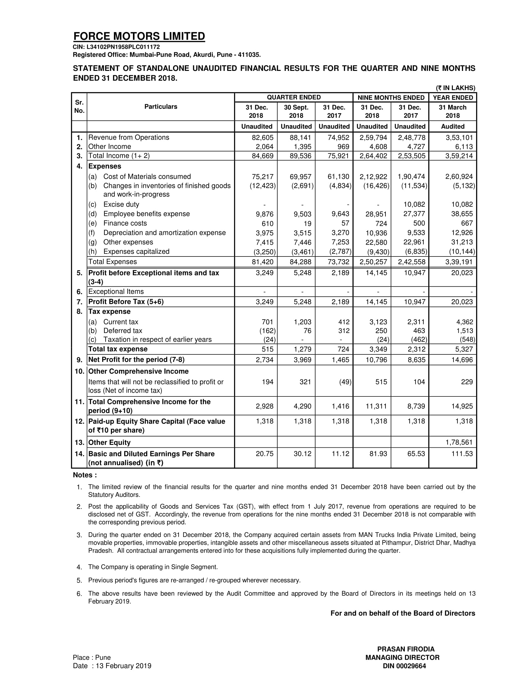 Unaudited Financial Results for the Quarter and nine months ended 31 December 2018