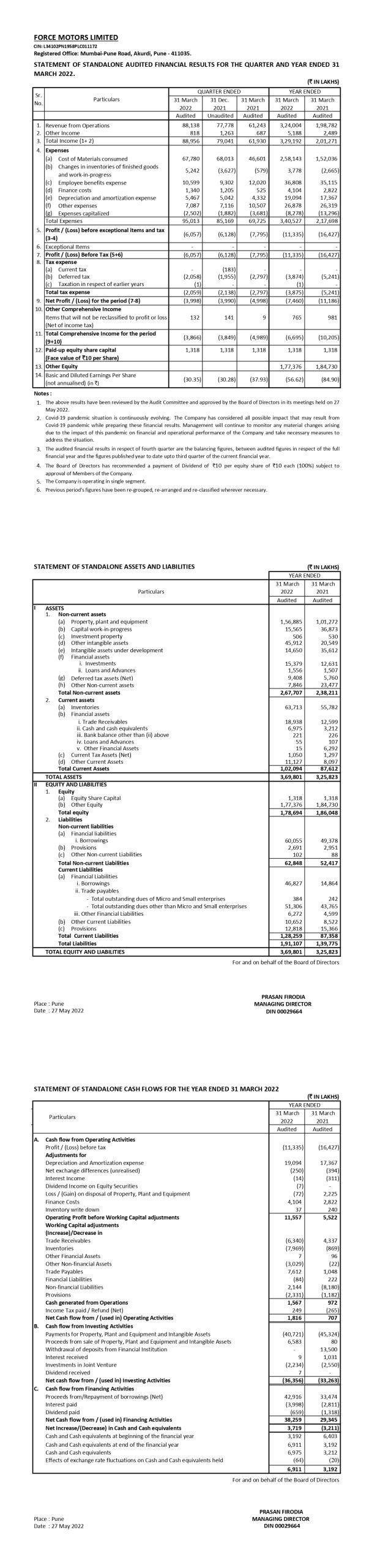 Statement of Standalone Audited Financial Results for the Quarter and Year ended 31st March 2022.
