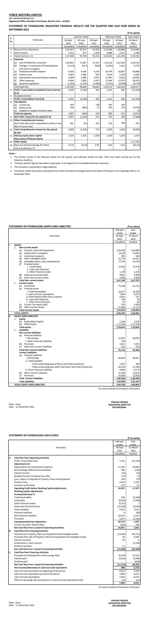 Statement of Standalone Unaudited Financial Results for the Quarter and Half-Year ended 30th September 2022.