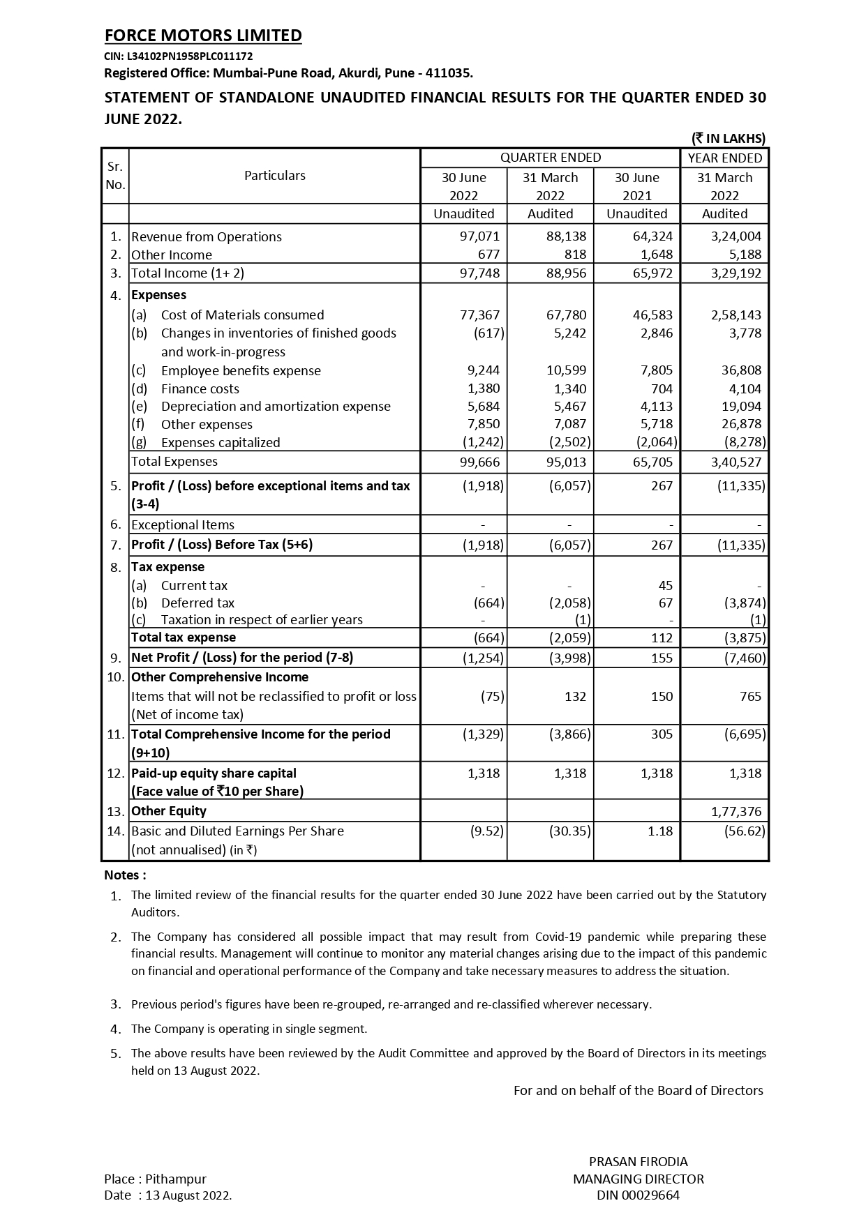 Statement of Standalone Unaudited Financial Results For The Quarter Ended 30th June 2022.