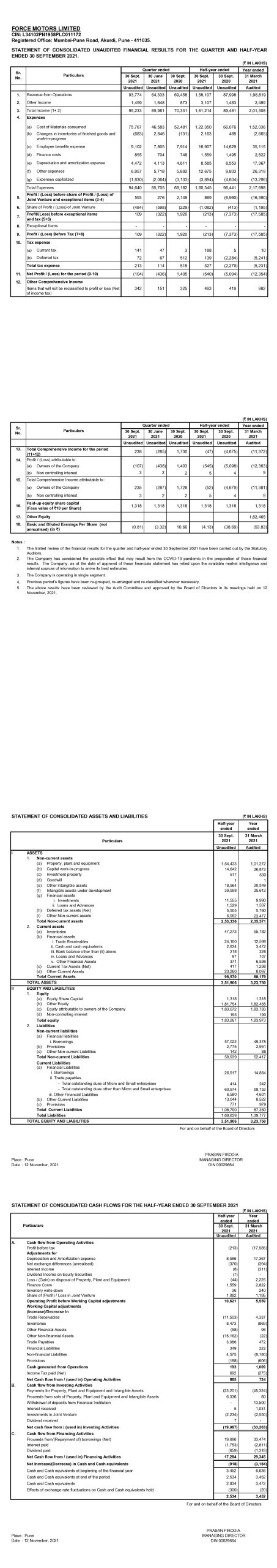 Statement of consolidated unaudited financial results for the quarter and half-year ended 30th September 2021.