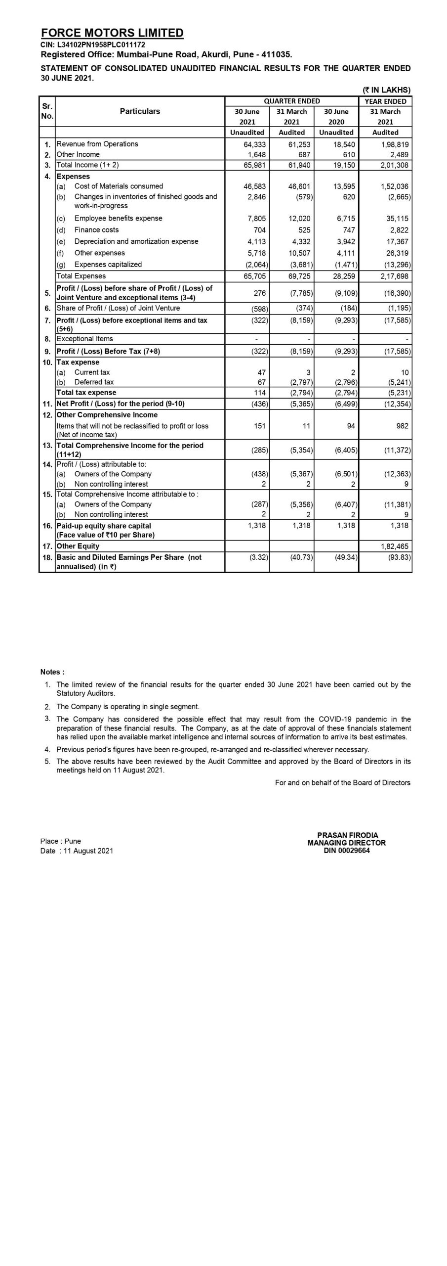 Statement of consolidated unaudited financial results for the quarter ended 30th June 2021.