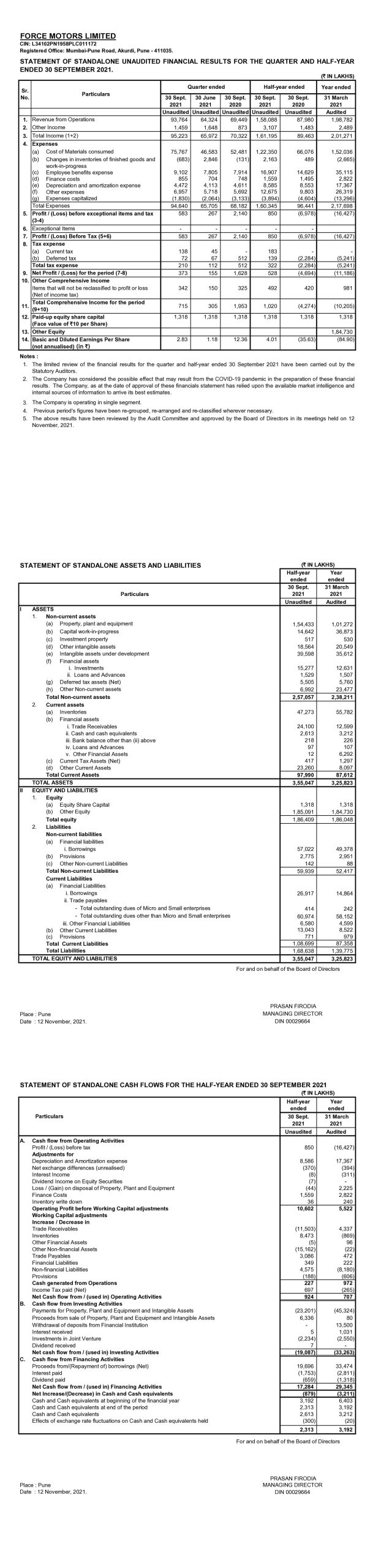 Statement of standalone unaudited financial results for the quarter and half-year ended 30th September 2021.