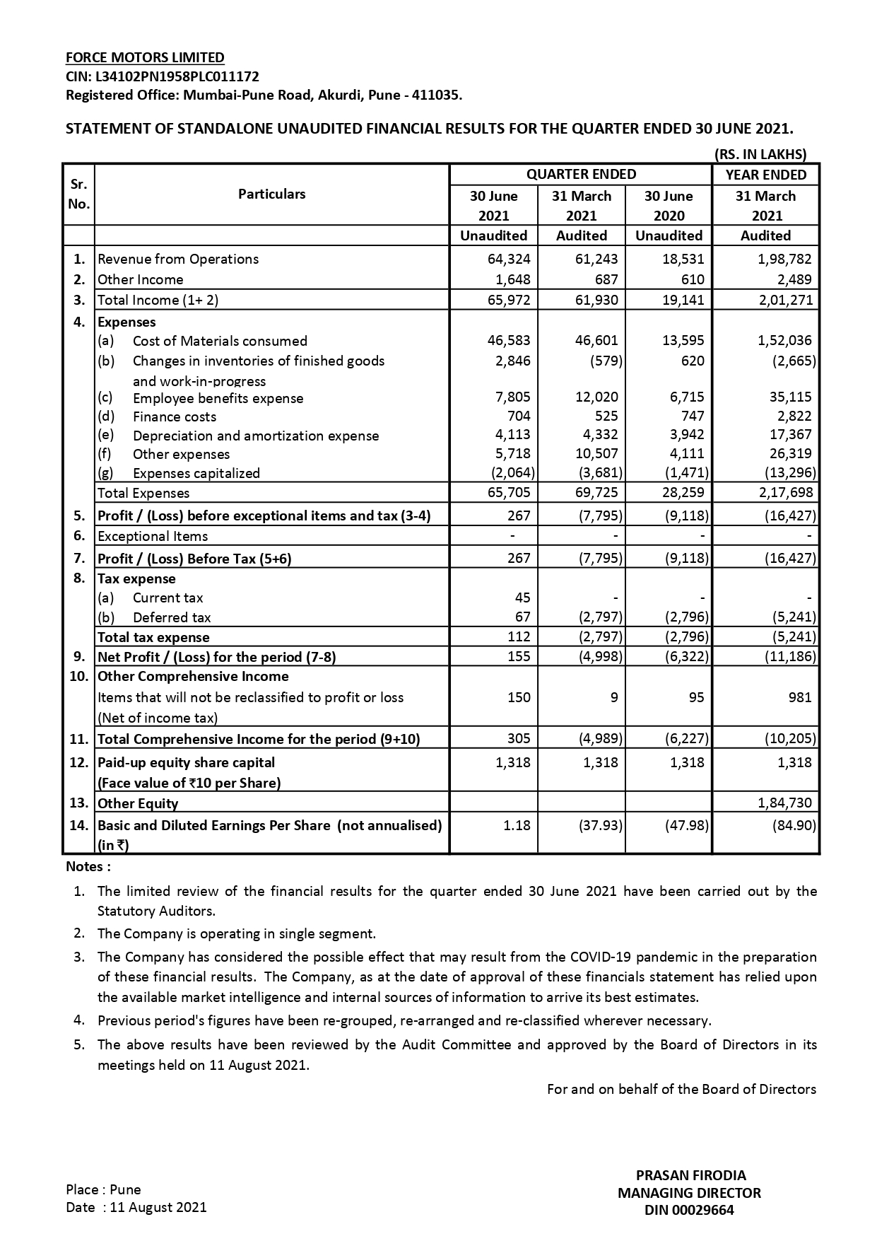 Statement of standalone unaudited financial results for the quarter ended 30th June 2021.