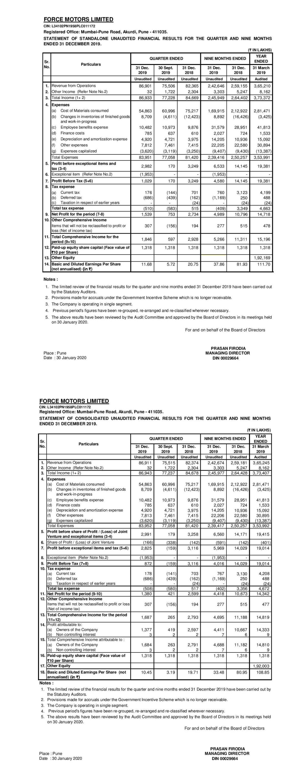 Statement of standalone unaudited financial result for the quarter and nine months ended 31st December 2019.