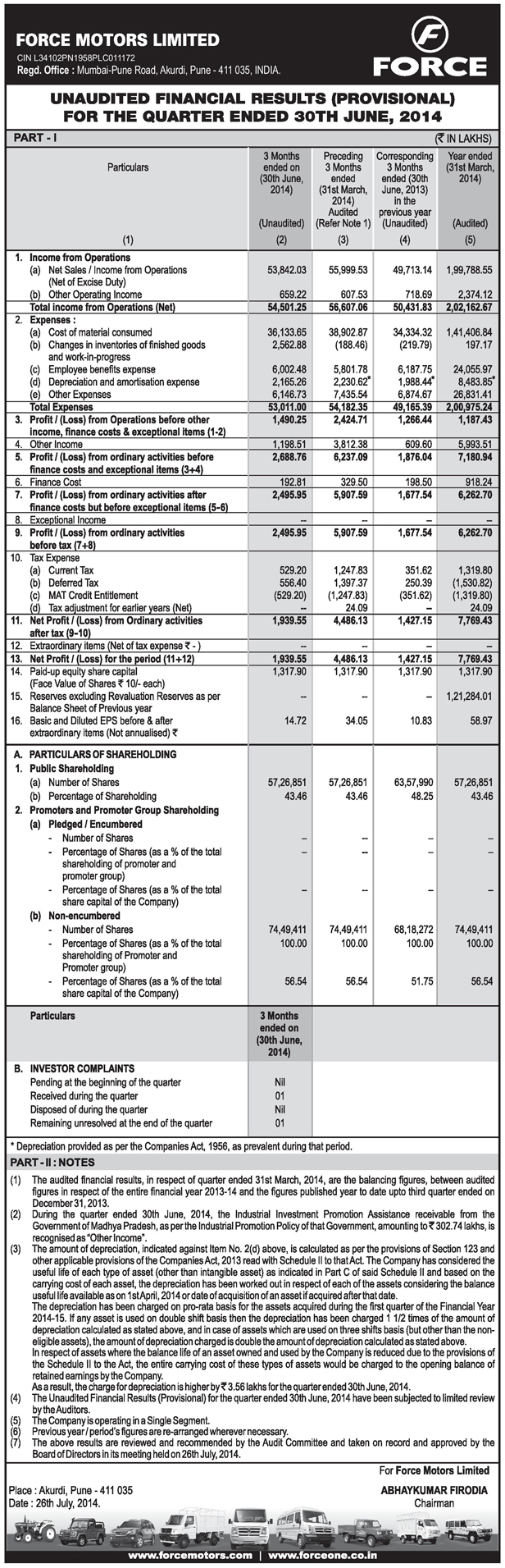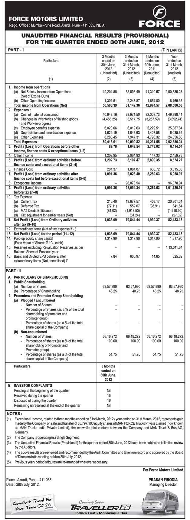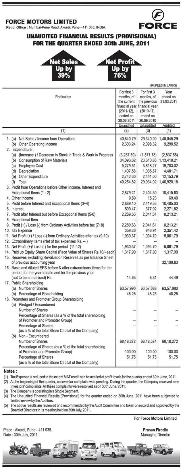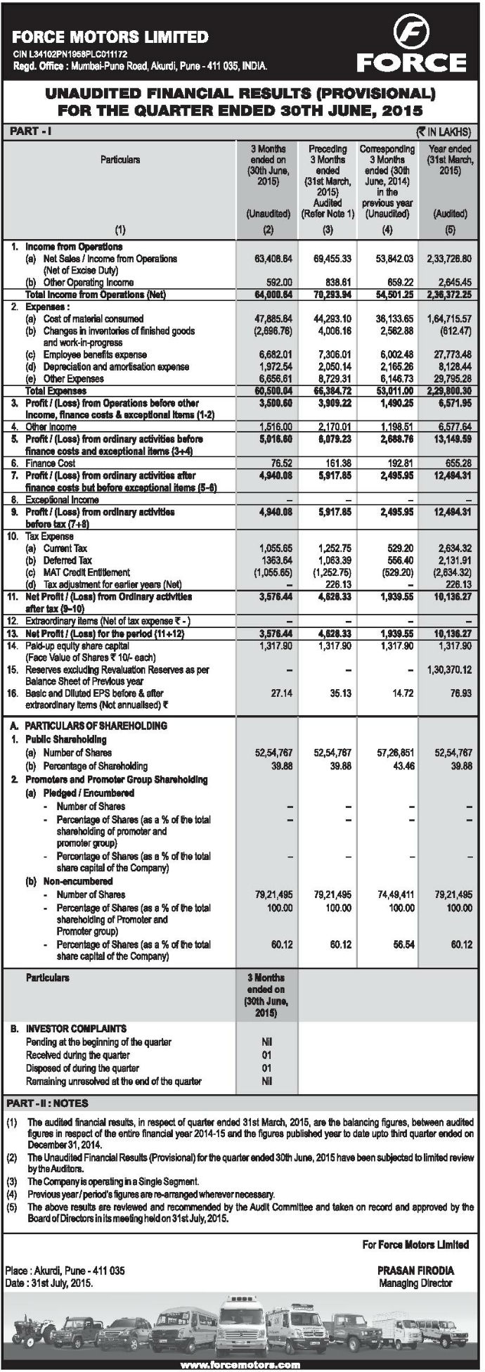 Unaudited Financial Results (Provisional) for the Quarter Ended