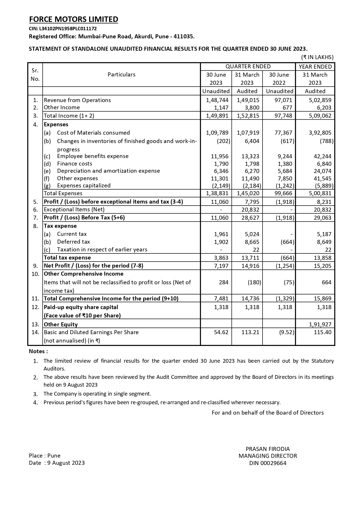 Statement of Standalone Unaudited Financial Results For The Quarter Ended 30th June 2023.