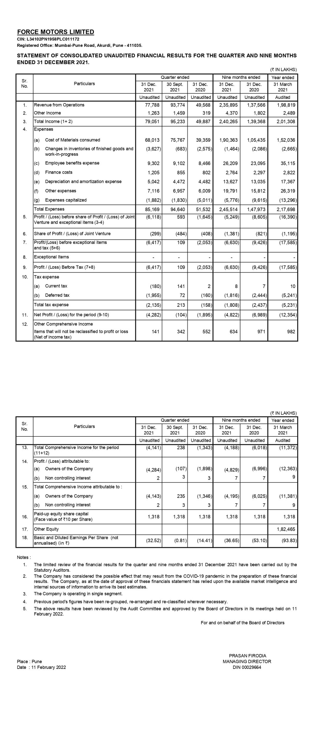 Statement of consolidated unaudited financial results for the quarter and nine months ended 31st December 2021.