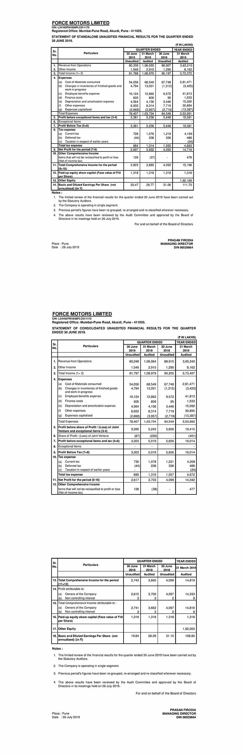 Statement of standalone unaudited financial results for the quarter ended 30th June, 2019.