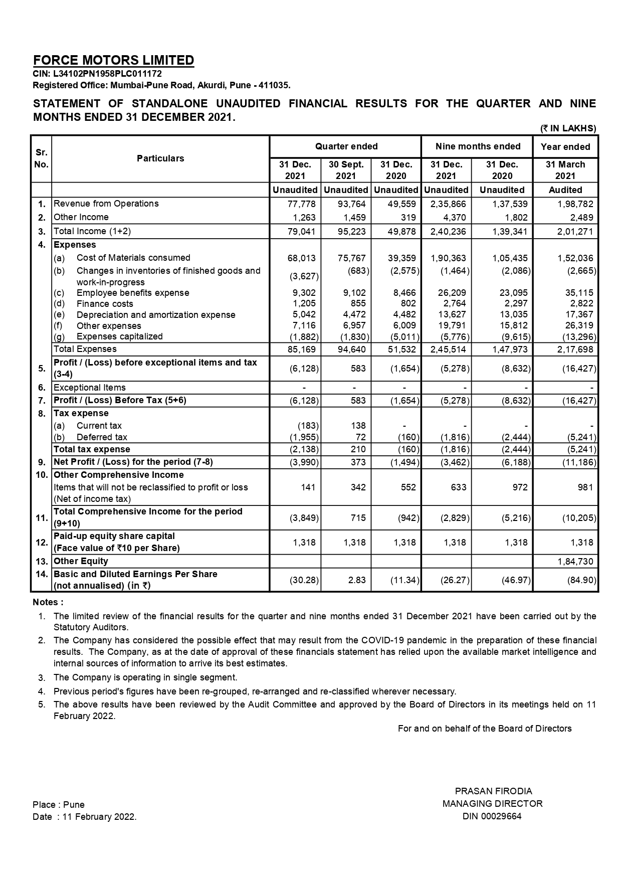 Statement of standalone unaudited financial results for the quarter and nine months ended 31st December 2021.